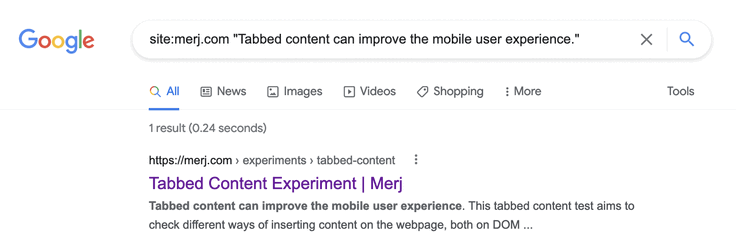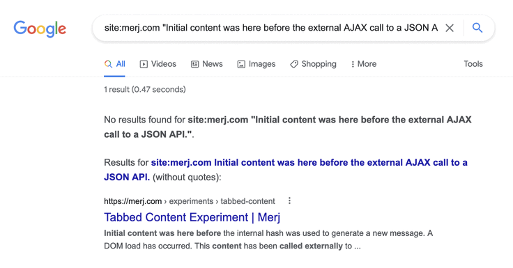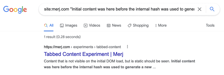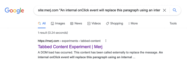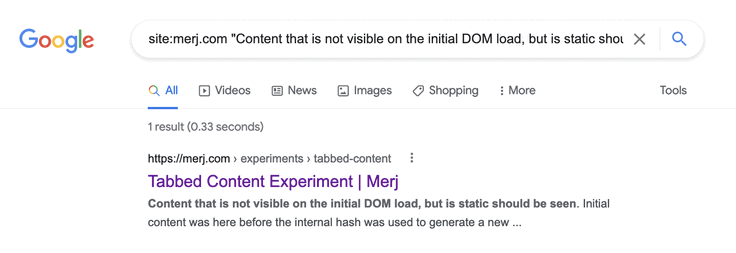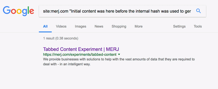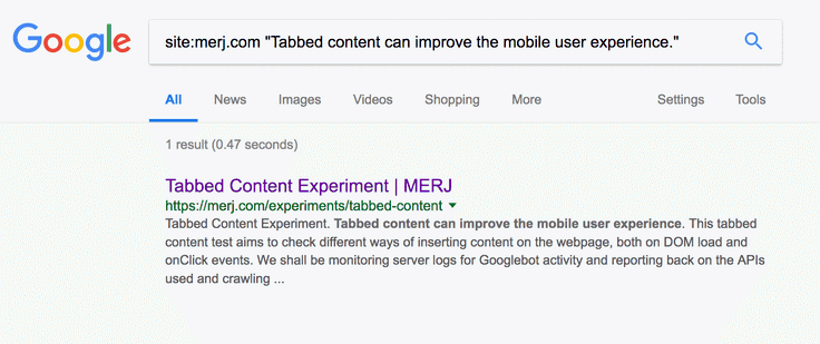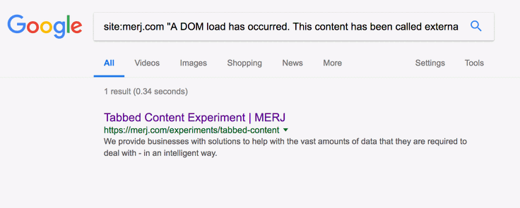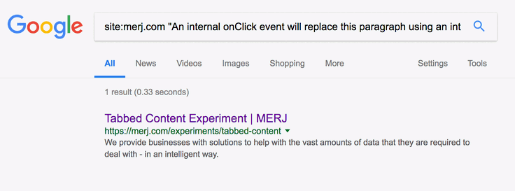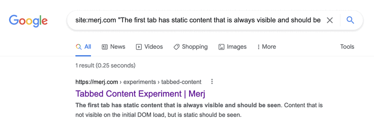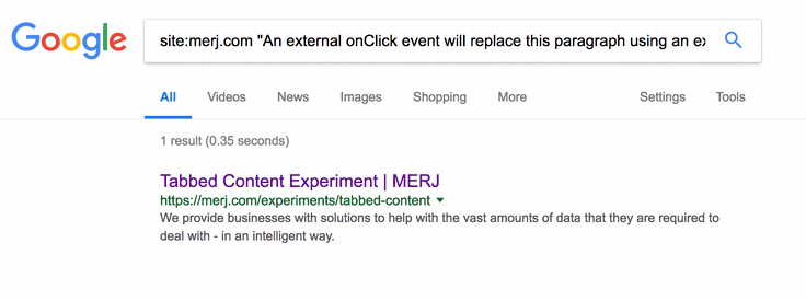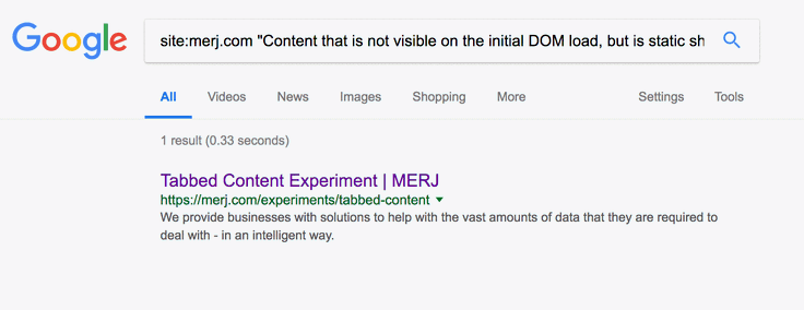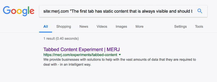 1site:merj.com "The first tab has static content that is always visible and should be seen."During 2018, Google successfully indexed the content.