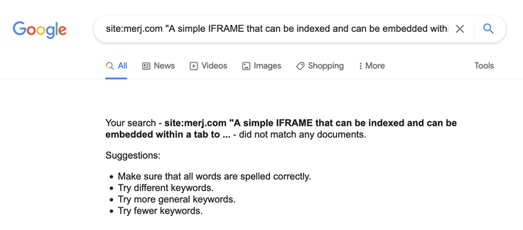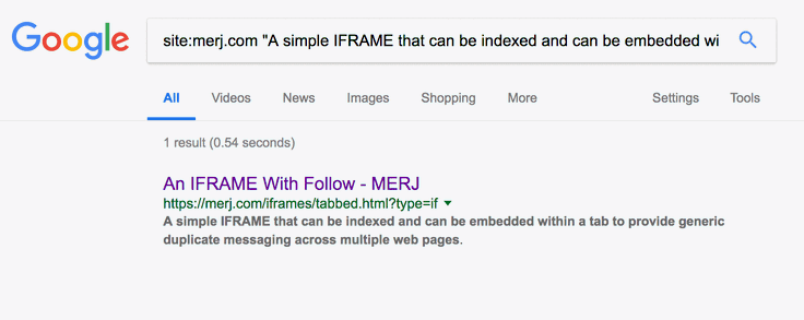 1site:merj.com "A simple IFRAME that can be indexed and can be embedded within a tab to provide generic duplicate messaging across multiple web pages."During 2018, Google successfully indexed the content. The iFRAME is only linked to through this web page. It has been found and indexed.