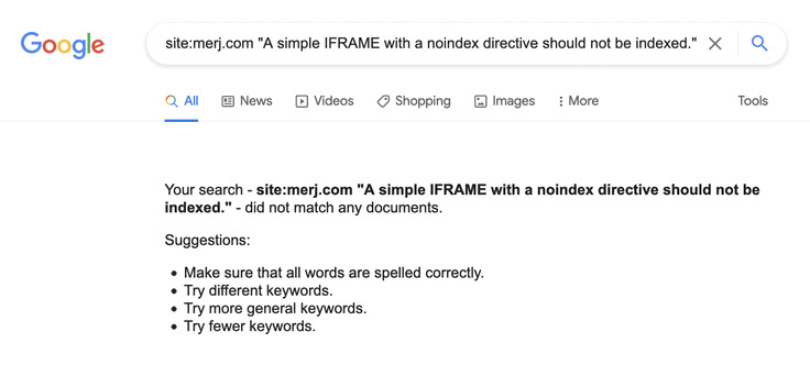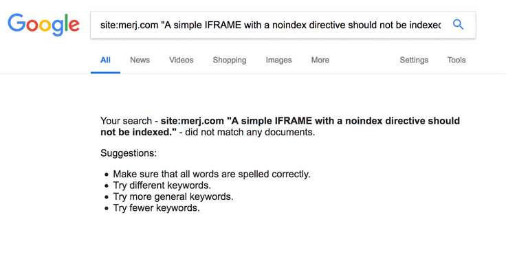 1site:merj.com "A simple IFRAME with a noindex directive should not be indexed."During 2018, Google did not index the content.