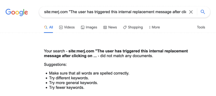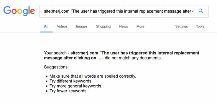 1site:merj.com "The user has triggered this internal replacement message after clicking on an onClick tab."During 2018, Google did not index the content.