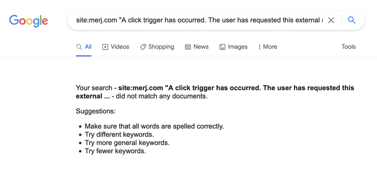 1site:merj.com "A click trigger has occurred. The user has requested this external replacement message."During 2018, Google did not index the content.