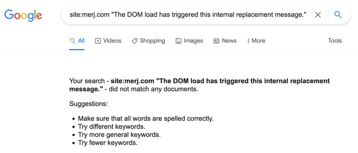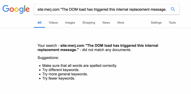 1site:merj.com "The DOM load has triggered this internal replacement message."During 2018, Google did not index the content.