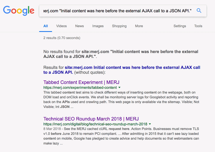 1site:merj.com "Initial content was here before the external AJAX call to a JSON API."During 2018, Google did not index the content.