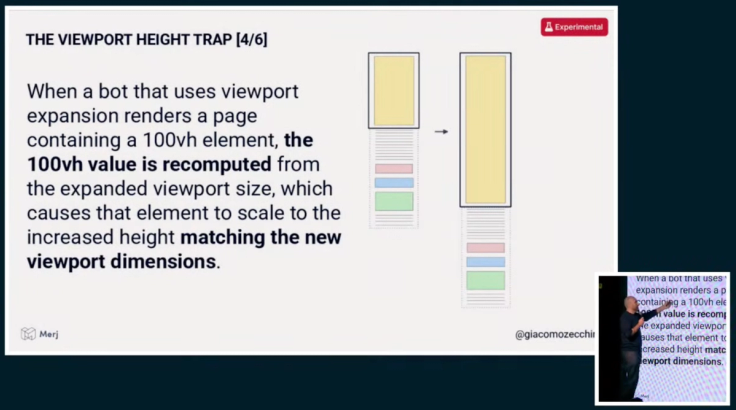 A major focus of Giacomo’s talk was how rendering quirks, viewport expansion, and layout techniques like 100vh hero sections can cause crawlers to completely misunderstand page structure, hide key content, or misjudge its priority.