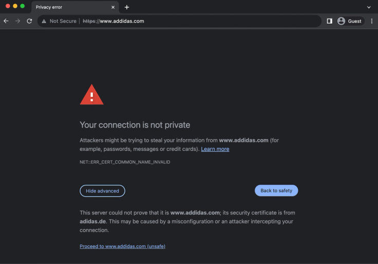 Case Study Analysis: A good example is addidas.com spelled with two "d", which is a typo of adidas.com. Adidas appears to own the typo domain but has not handled the redirection correctly. The screenshot below shows that Adidas does not redirect the typo domain HTTP or HTTPS to the correct domain and that the HTTP certificate is not valid. An SSL warning screen is shown below.