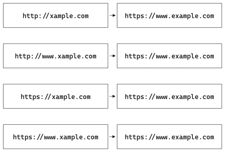 1server {2 listen 443 ssl;3 server_name xample.com;4 ssl_certificate /path/to/your/certificate.crt;5 ssl_certificate_key /path/to/your/private.key;6 return 301 https://www.example.com$request_uri;7}It's worth considering that the example above only covers for the typos for example.com. There may also be similar typos for each top-level domain, i.e. xample.de, xample.it, xample.fr.
